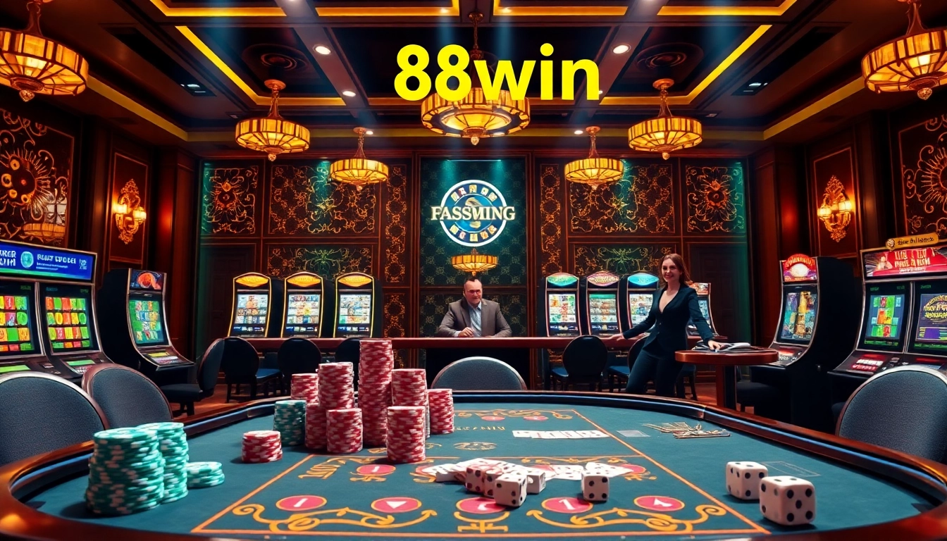 Experience the excitement of gambling at 58win đăng nhập with a vibrant casino setting featuring poker chips and slot machines.